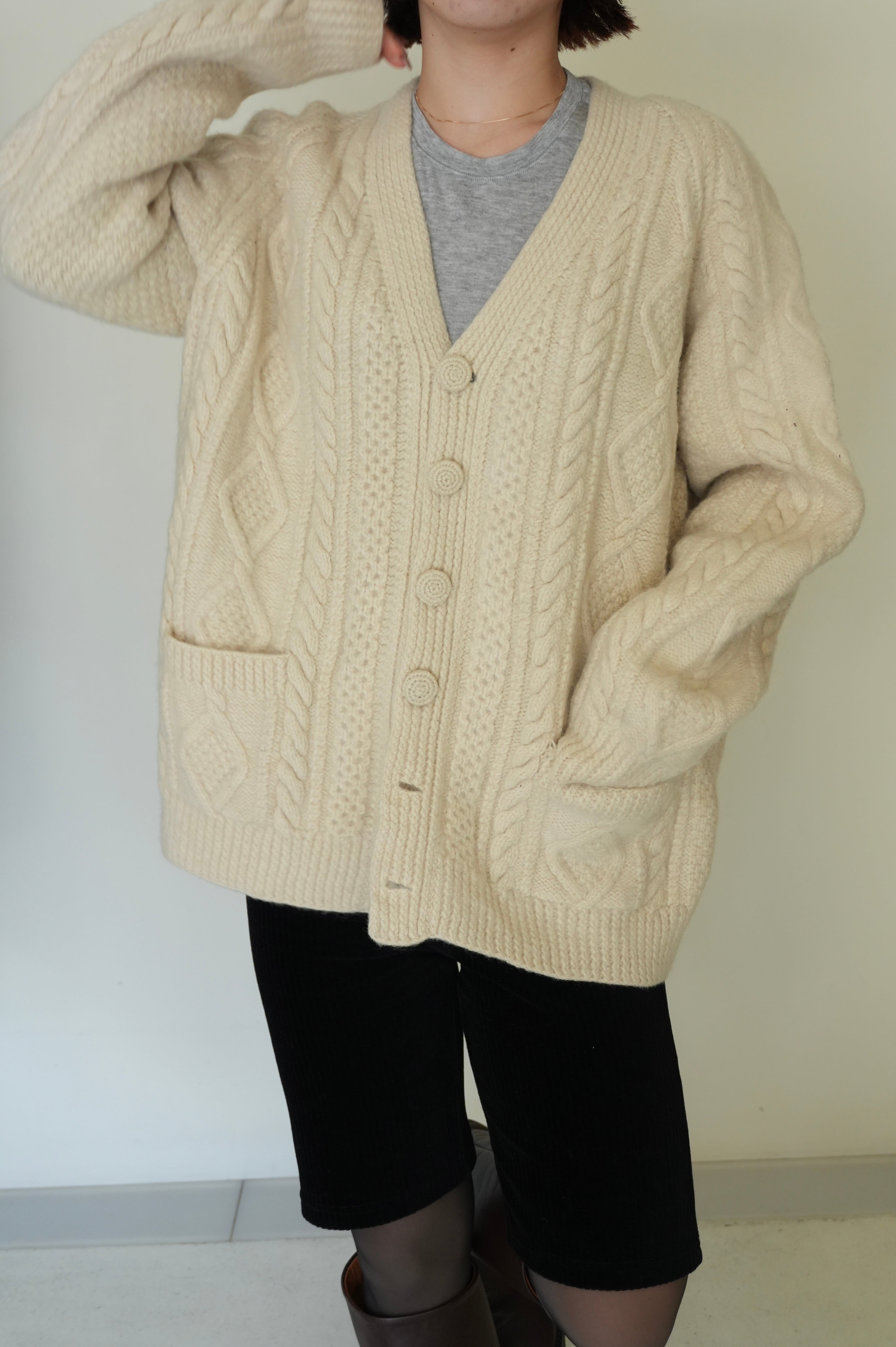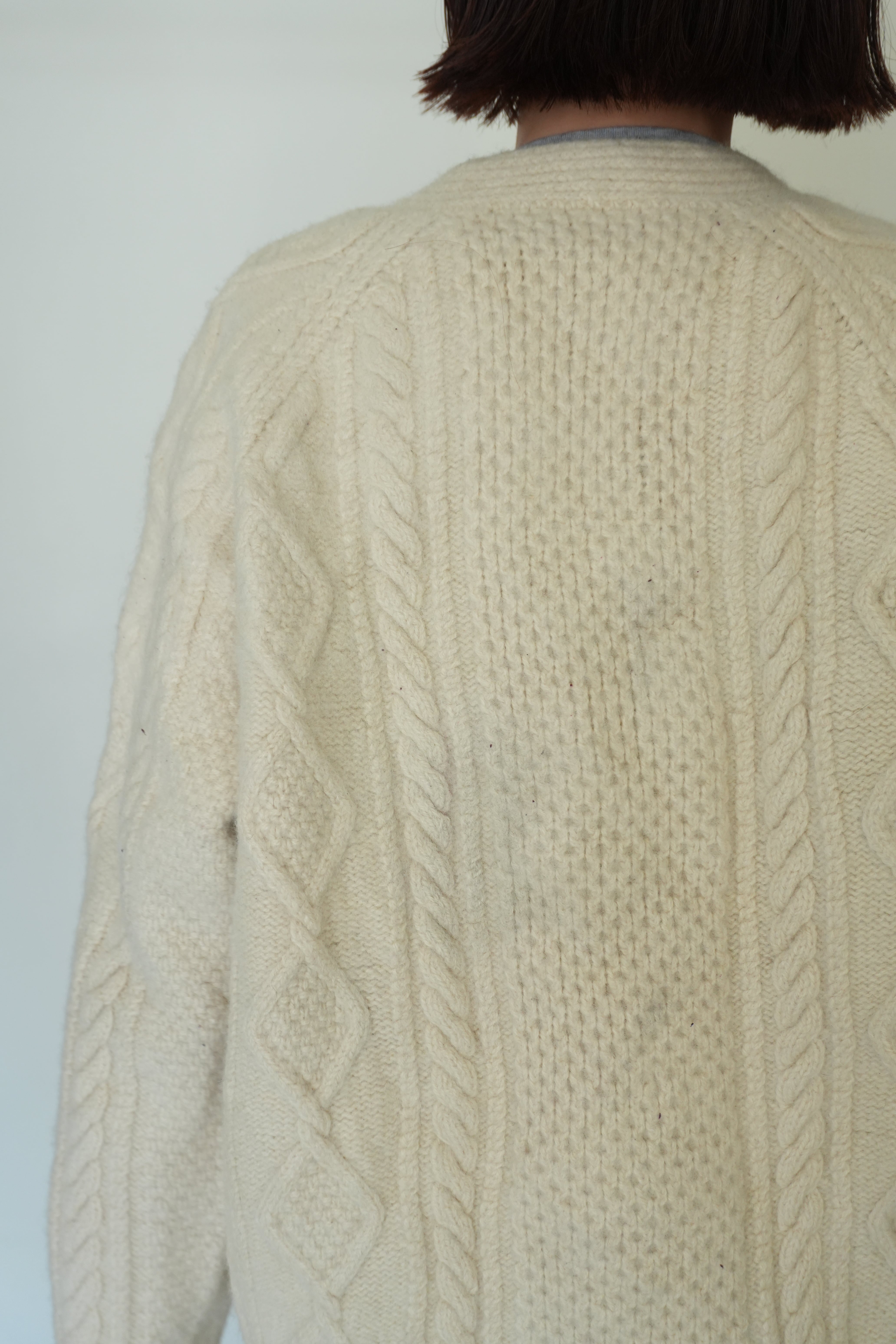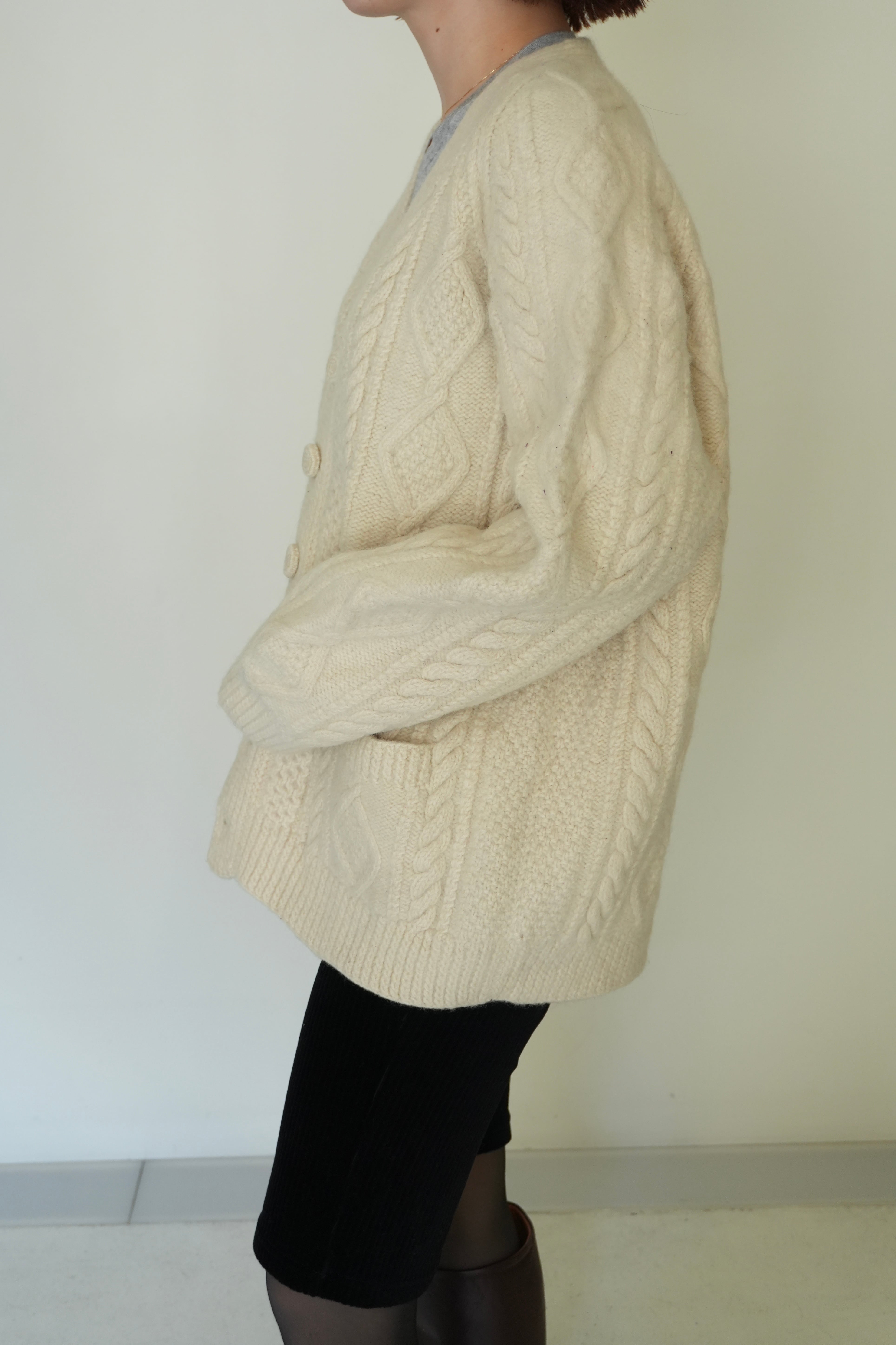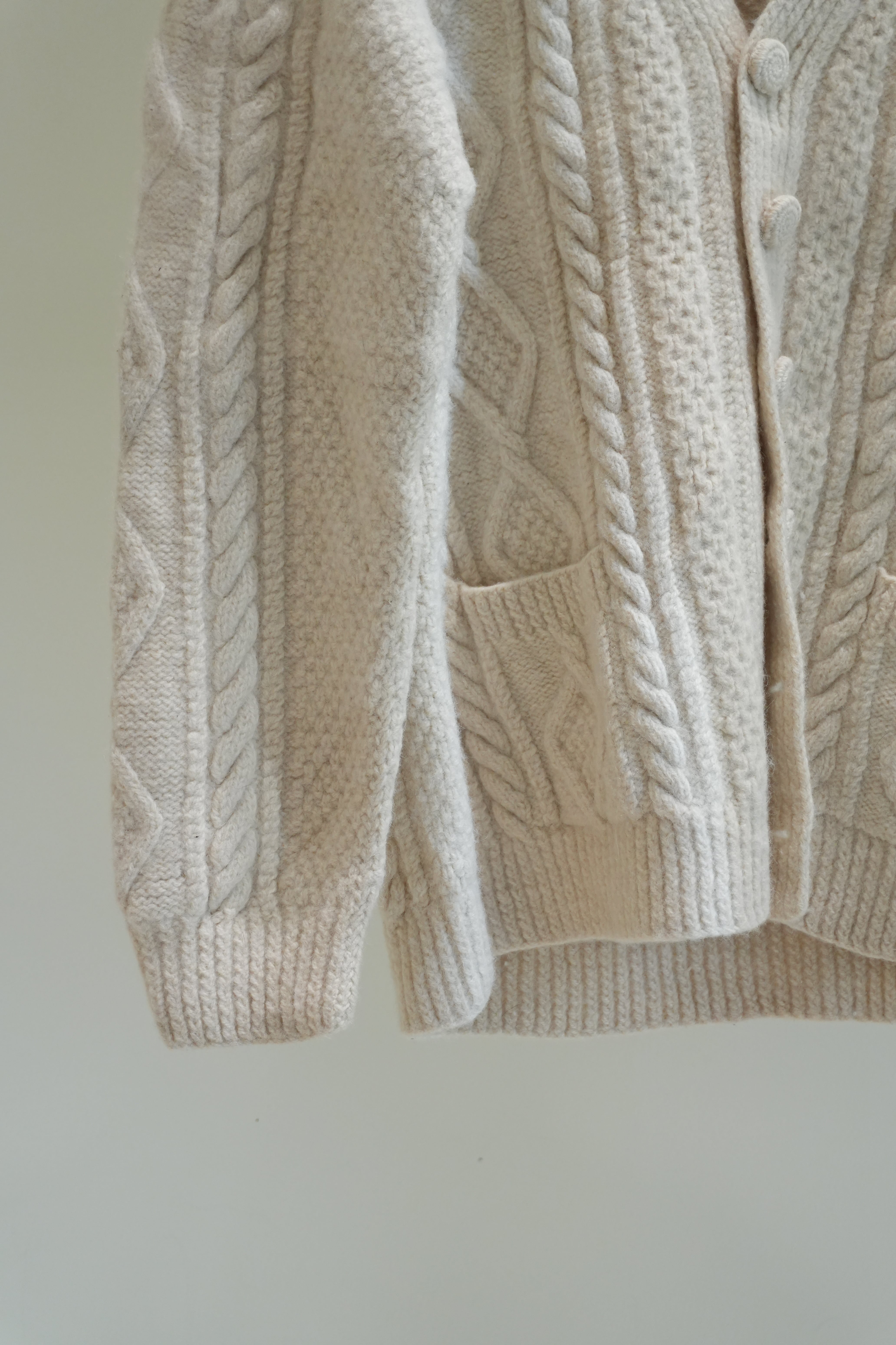 厚手の生地で立体的なフィッシャーマンニットカーディガン。
