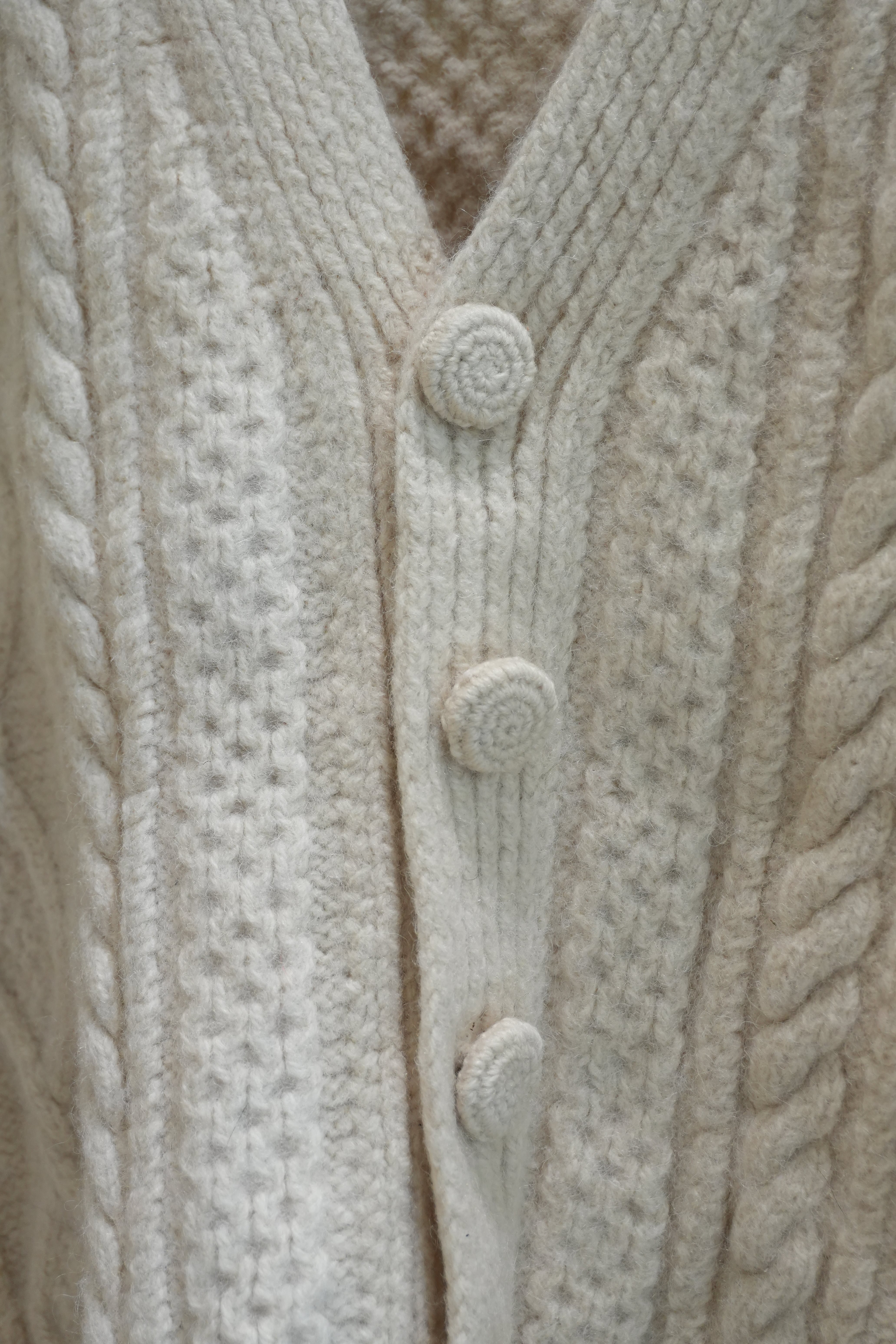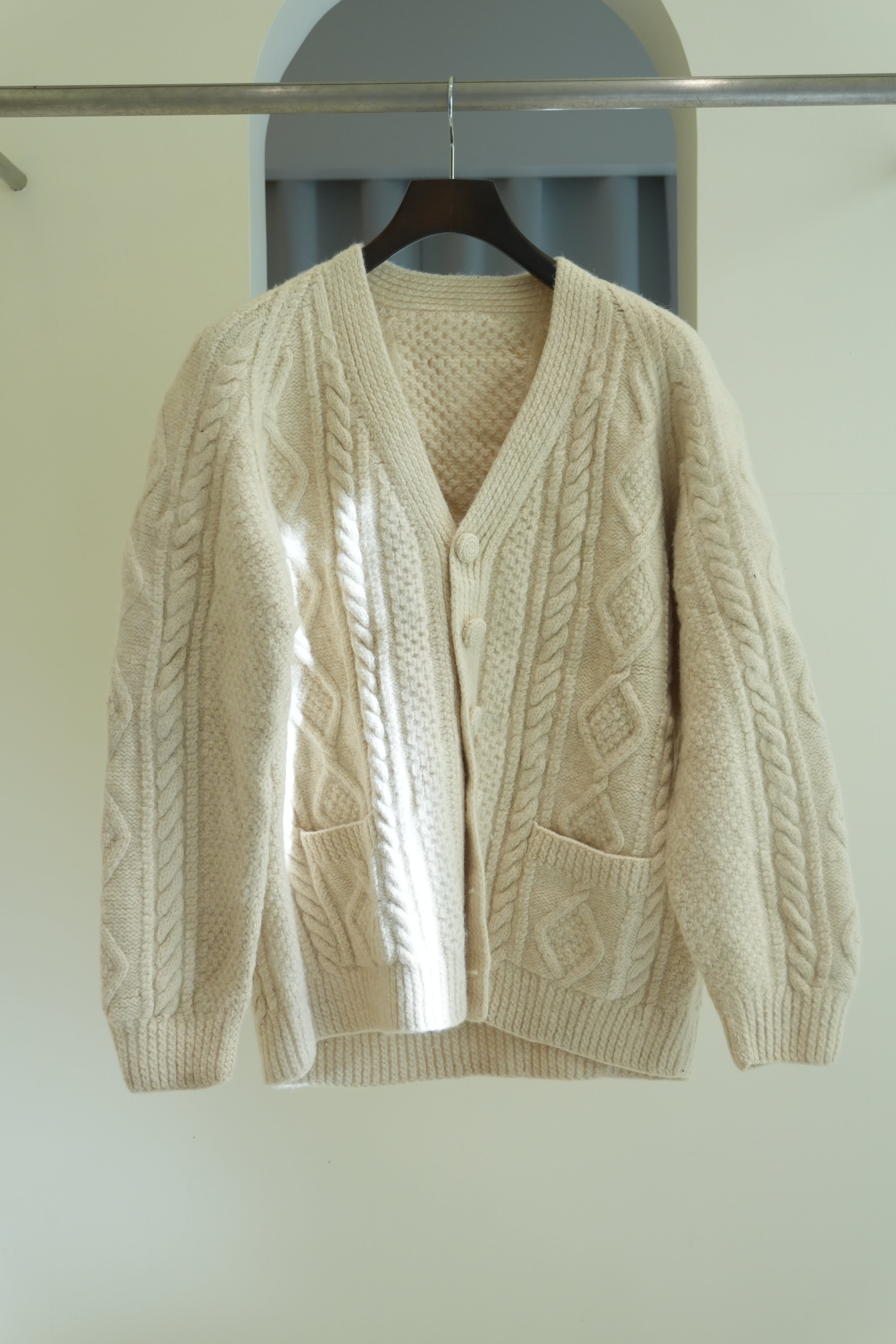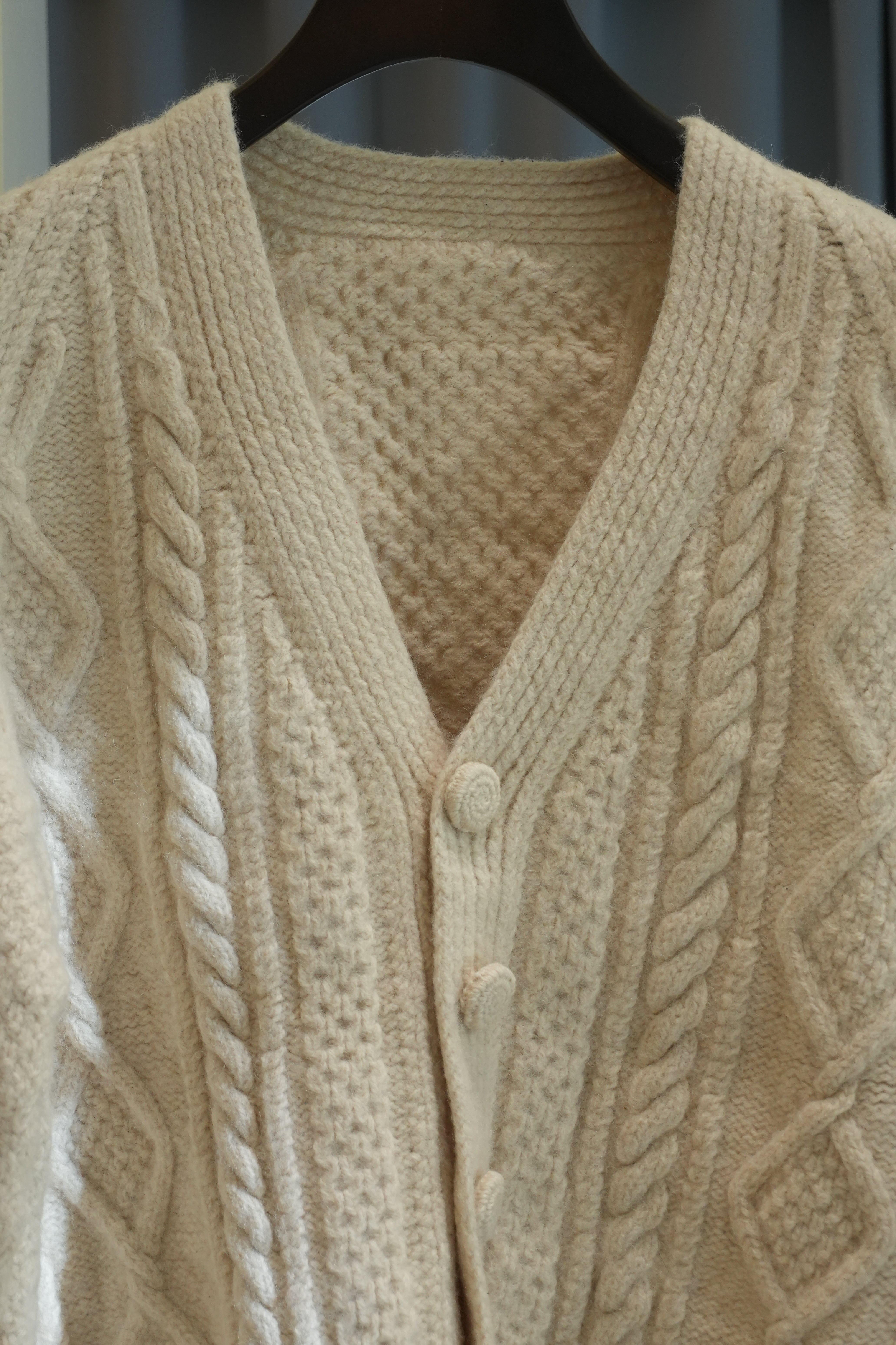厚手の生地で立体的なフィッシャーマンニットカーディガン。