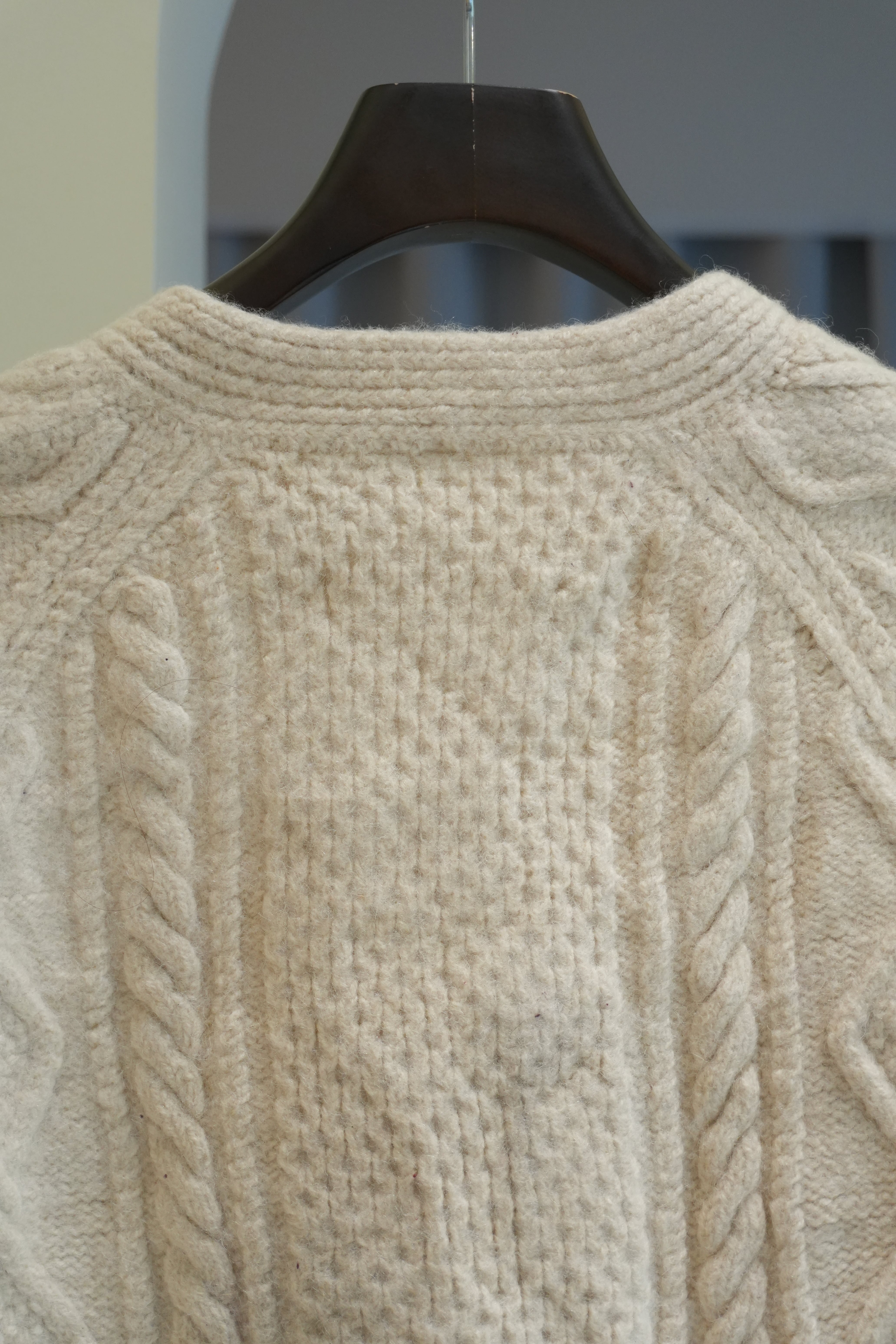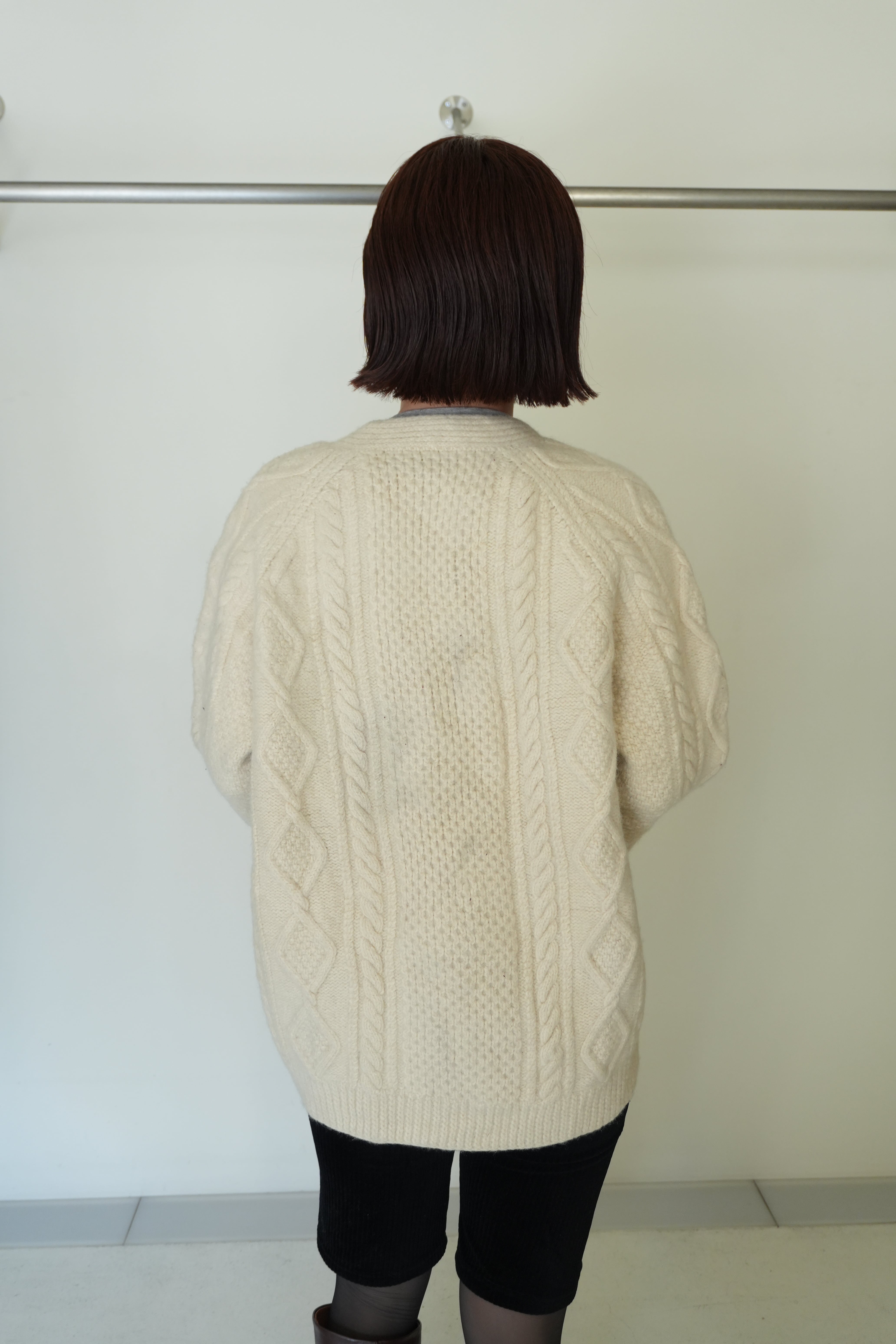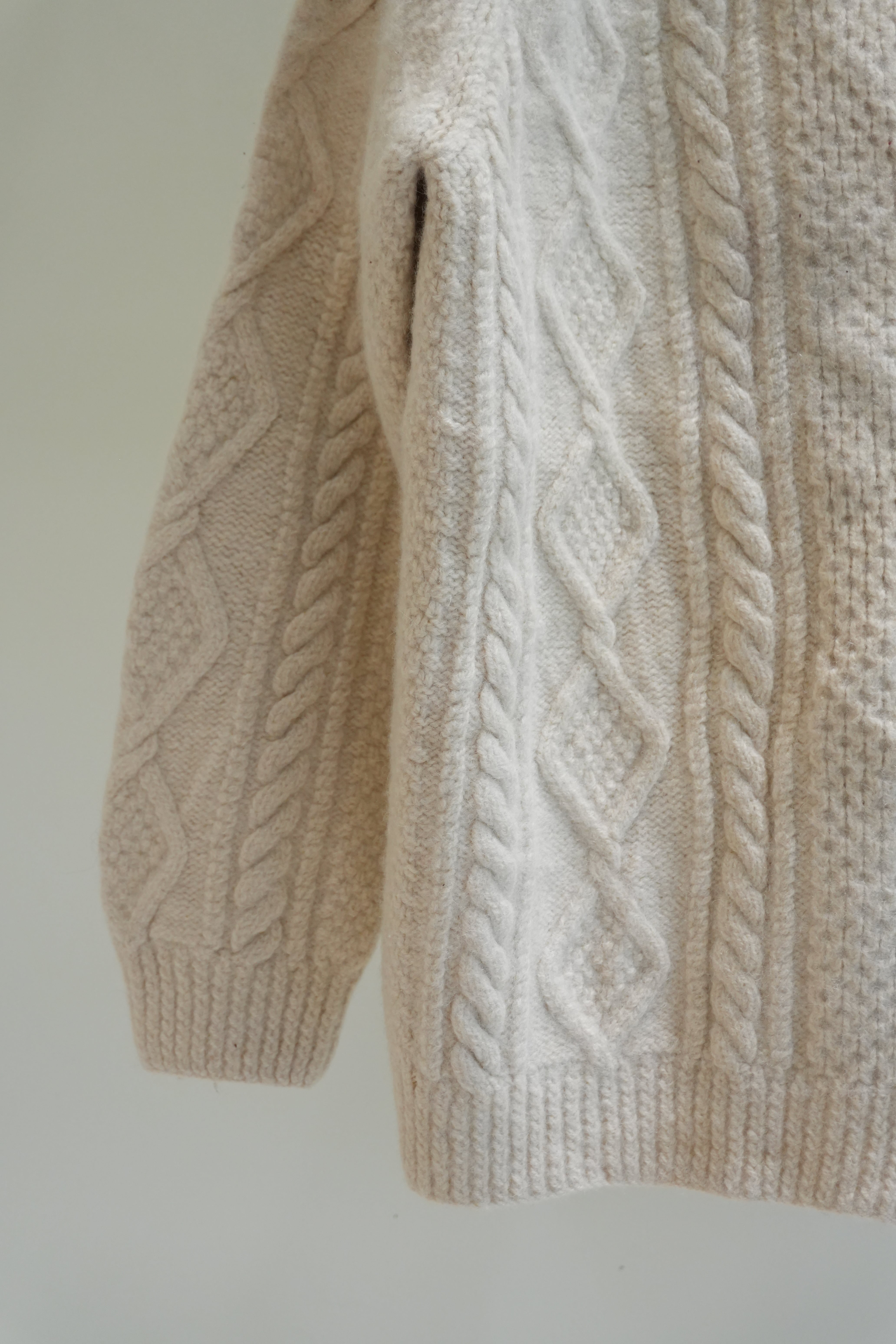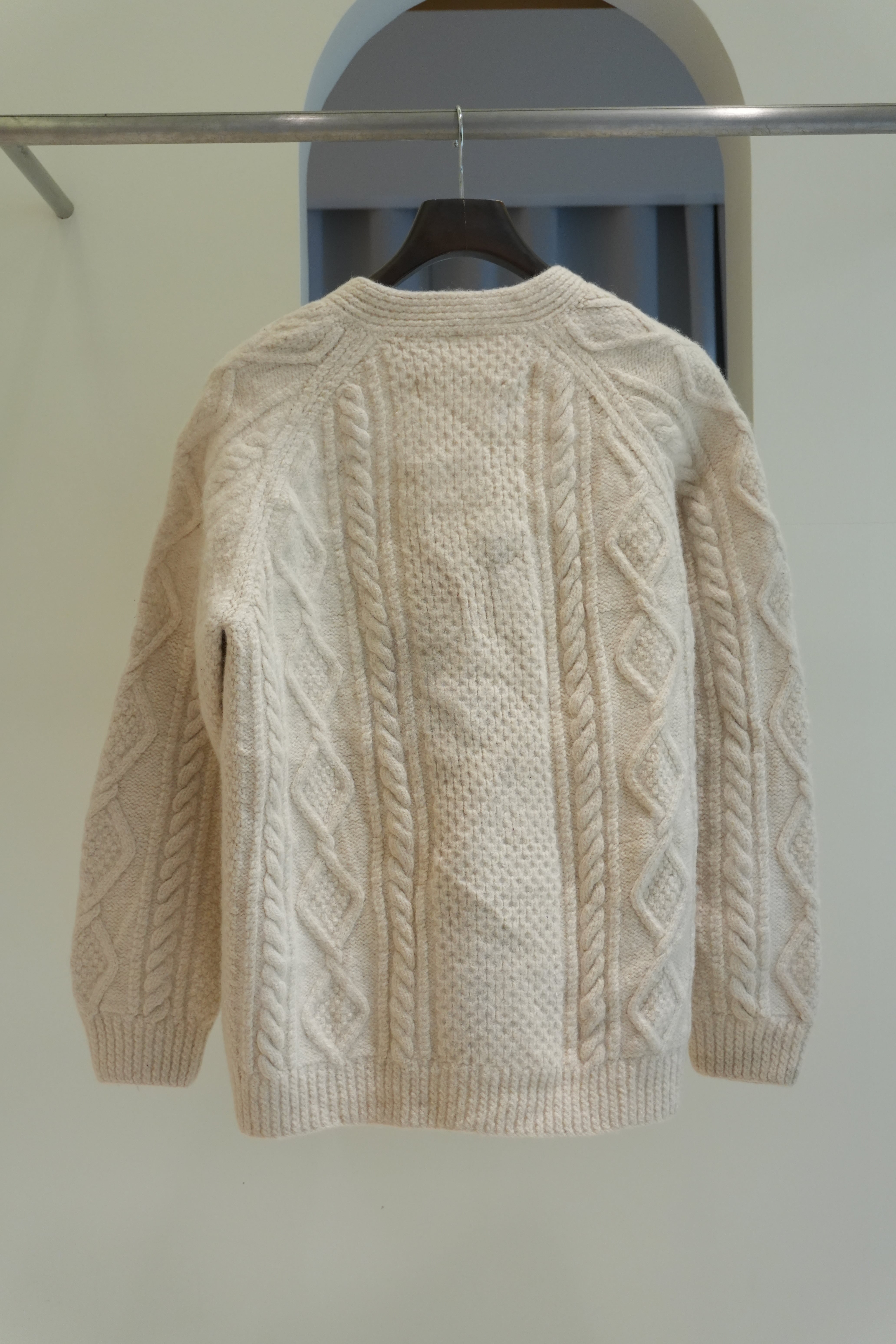 厚手の生地で立体的なフィッシャーマンニットカーディガン。