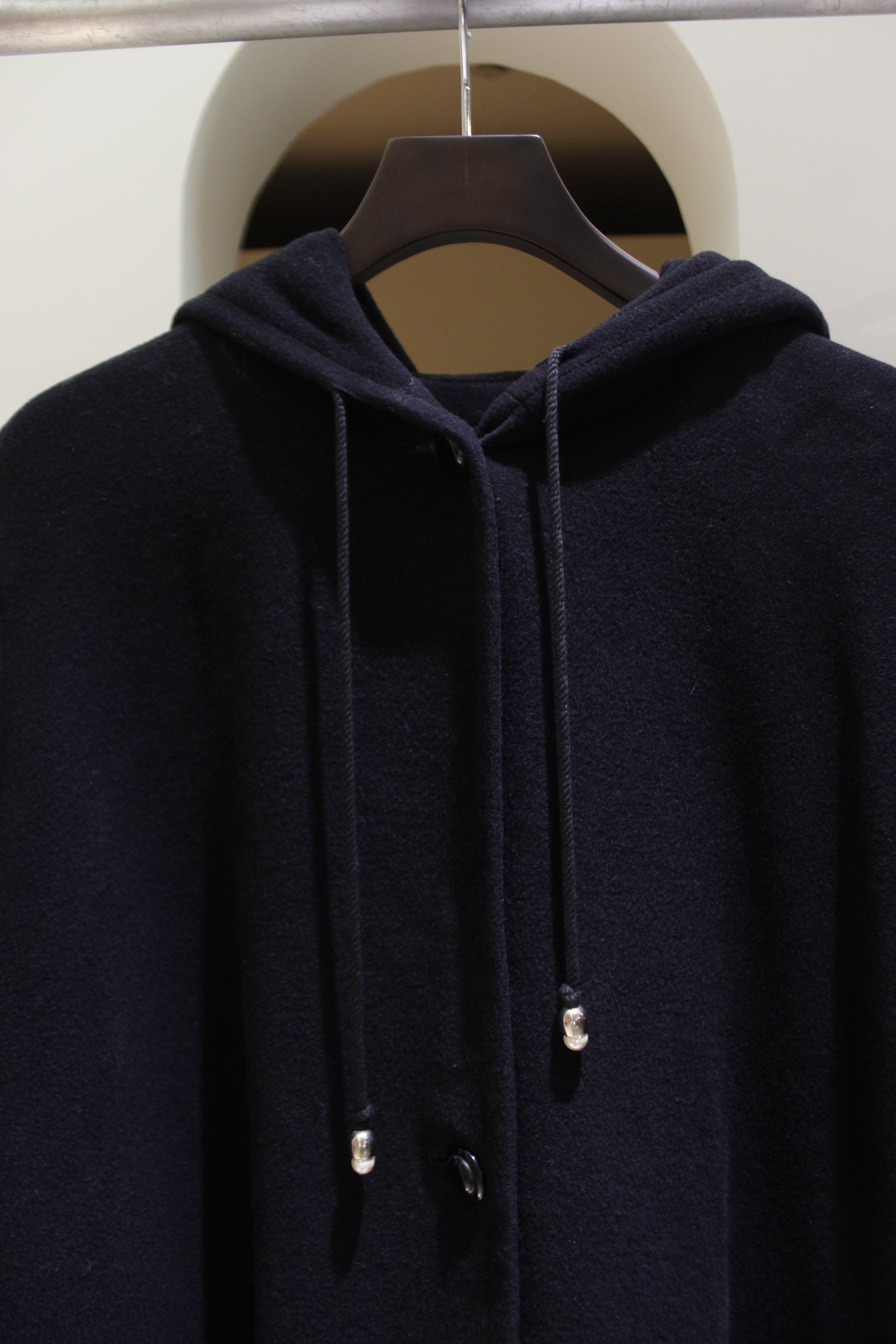 大きなフードのコード先にはパールの様な可愛らしいデザインが施されているのもポイントです。