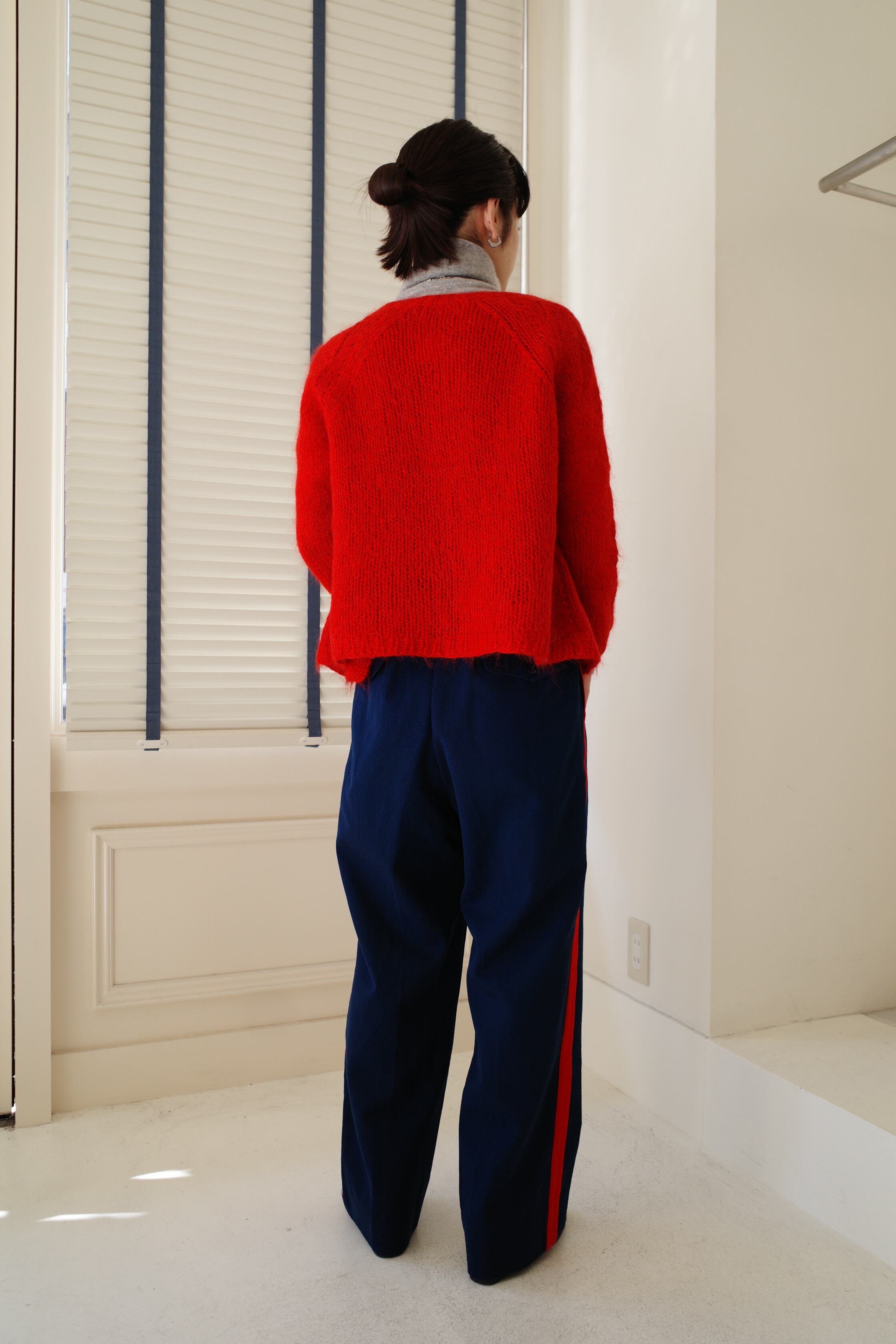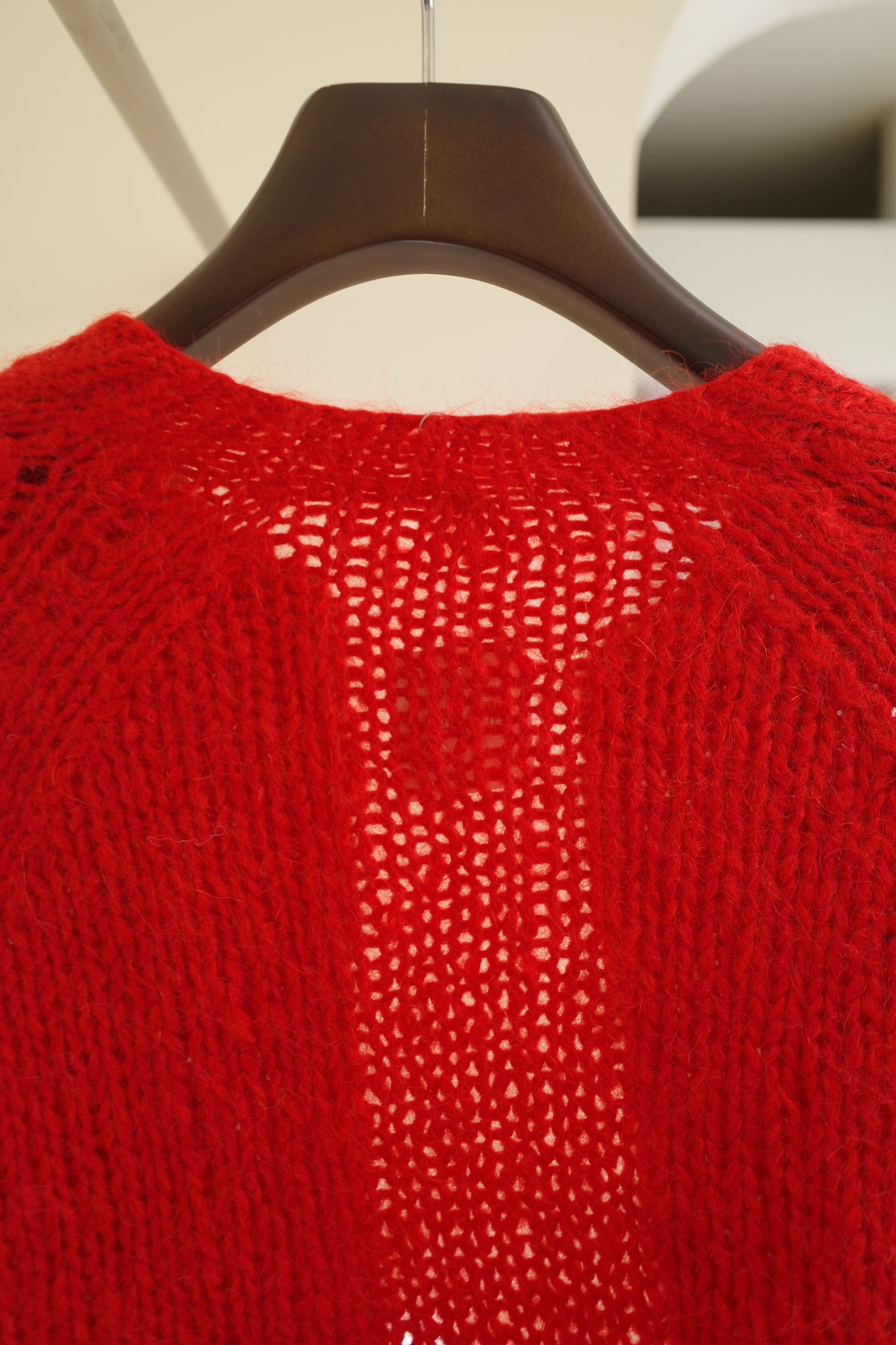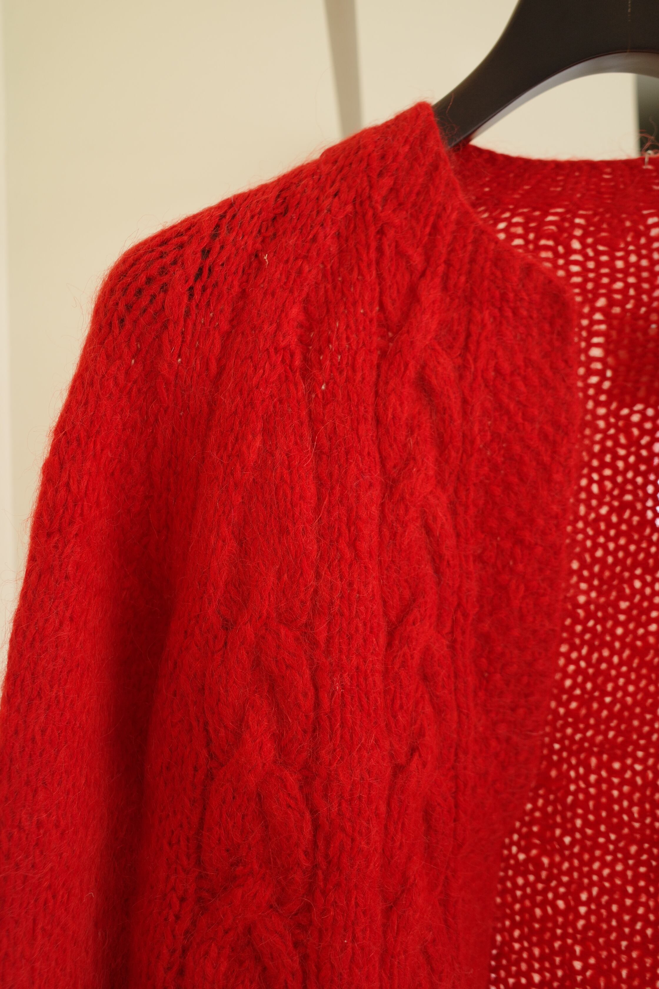 鮮やかな赤が目を引くニットカーディガン。