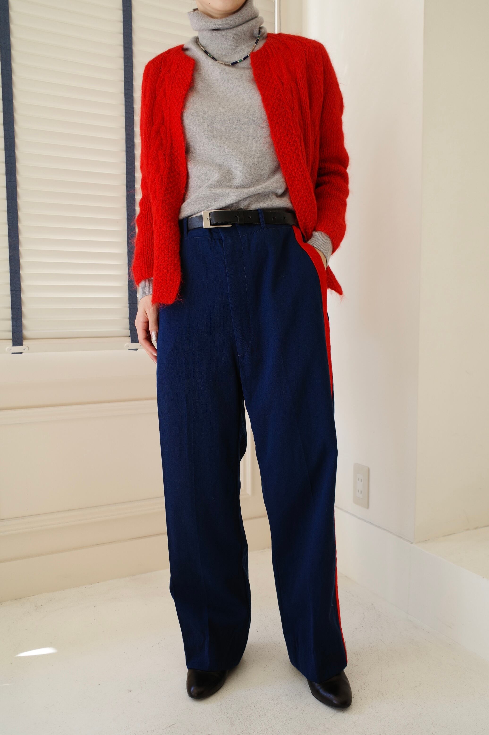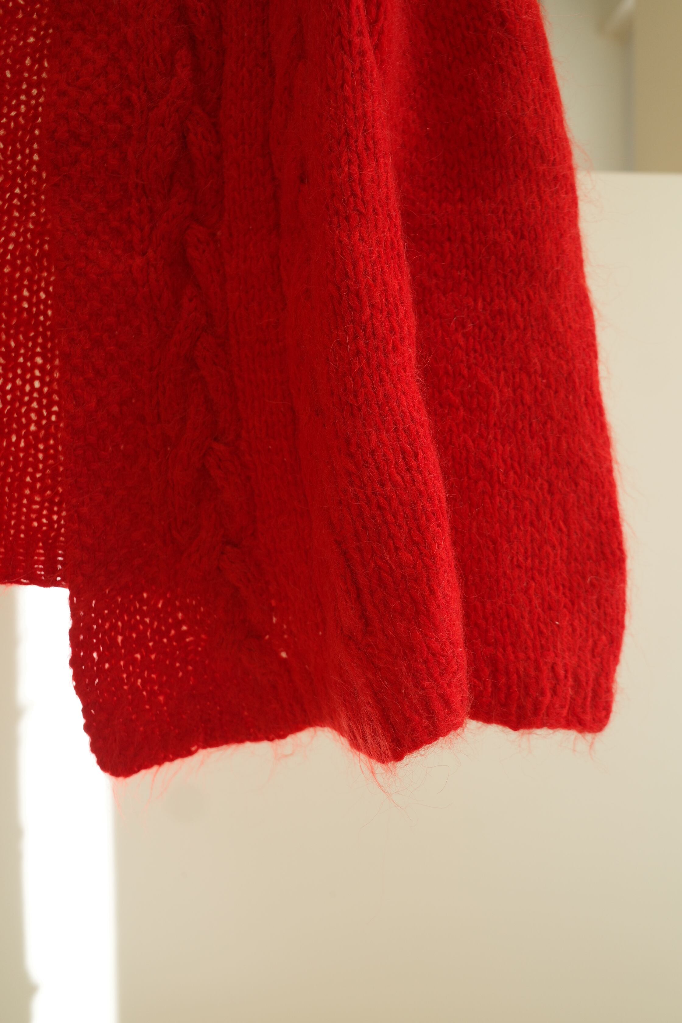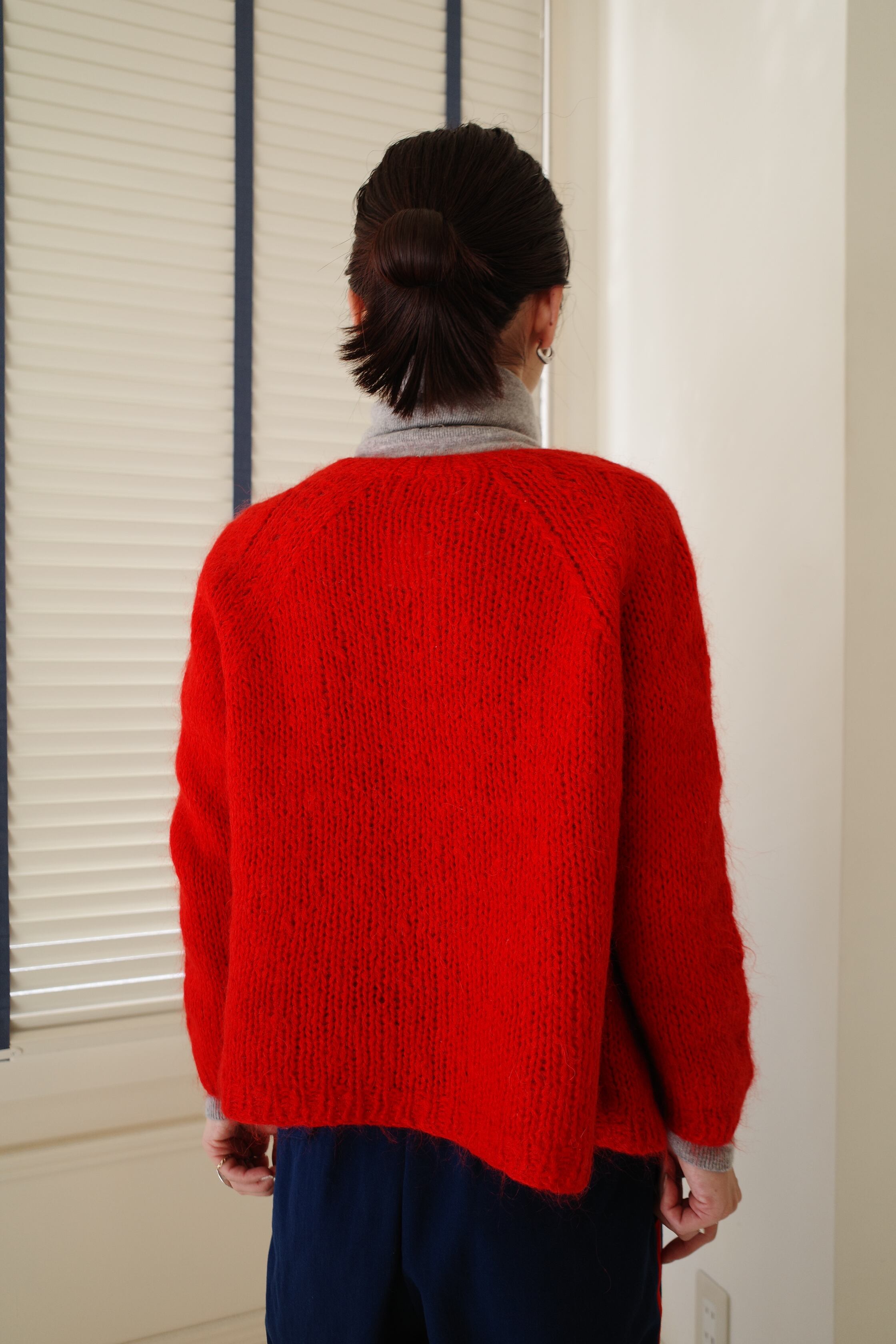鮮やかな赤が目を引くニットカーディガン。